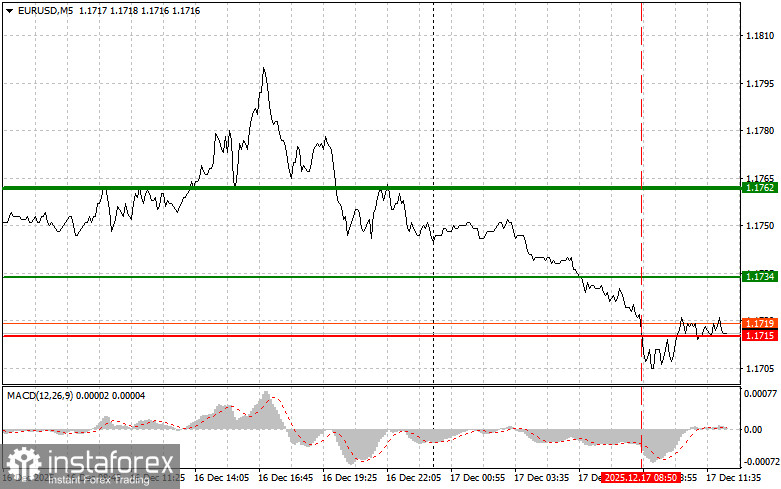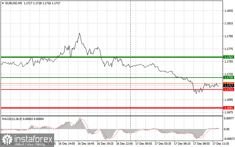 場景 #2: 如果價格在 MACD 指標處於超賣區時兩次測試 1.1711,我也計劃買入歐元。這限制了該貨幣對的下行潛力,應觸發市場反轉向上。預期目標為 1.1730 和 1.1762。