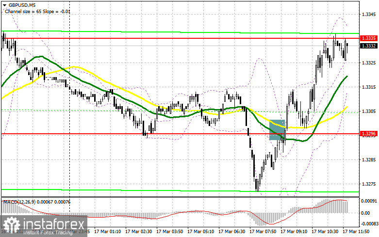 В своем утреннем прогнозе я обращал внимание на уровень 1.3296 и планировал от него принимать решения по входу в рынок. Давайте посмотрим на 5-минутный график и разберемся с тем, что там произошло. Прорыв и обратный тест 1.3296 привели к точке входа на продажу фунта, но до падения пары дело так и не дошло. На вторую половину дня техническая картина была пересмотрена.
