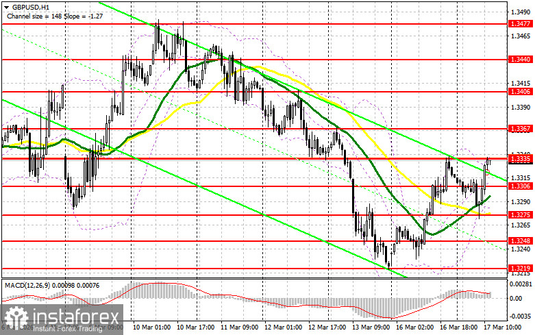 Медведи пока не сильно проявляют активность, хотя все шансы для этого были. Слабые данные по США наверняка дадут шанс на более крупную коррекцию пары, так что с продажами лучше не торопиться. Первоочередной задачей медведей на вторую половину дня будет защита сопротивления 1.3335. Лишь формирование там ложного пробоя станет подтверждением правильной точки входа на продажу с целью снижения в район поддержки 1.3306. Прорыв и обратный тест снизу вверх этого диапазона приведут к сносу стоп-приказов, открыв путь к 1.3275, что вернет медвежий рынок. Там ожидаю более активного проявления крупных покупателей. Самой дальней целью выступит область 1.3248, где собираюсь фиксировать прибыль. Если спрос на фунт сохранится во второй половине дня, а медведи не проявят себя в районе 1.3335, можно рассчитывать на более крупное восстановление пары. В таком случае продажи лучше всего отложить до теста сопротивления 1.3367. Открывать там короткие позиции буду только на ложном пробое. При отсутствии движения вниз и там, короткие позиции на отскок поищу в районе 1.3406, но лишь в расчете на коррекцию пары вниз на 30-35 пунктов внутри дня.