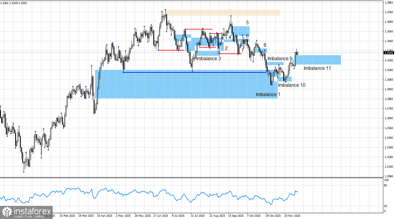 Графическая картина сейчас следующая. «Бычий» тренд может быть завершен, но «бычий» тренд по европейцу – совершенно точно не завершен. Таким образом, европейская валюта может вытянуть фунт «с того света». Быки оттолкнулись от «бычьего» имбаланса 1, от «бычьего» имбаланса 10, что придало им в конечном счете сил и уверенности в своих действиях и своей правоте. Вчера был образован еще один «бычий» имбаланс – 10, от которого цена может получить реакцию уже сегодня. Вероятно, заход в этот имбаланс будет более глубоким и понадобится несколько дней, чтобы зайти и выйти из него. Но отработка может быть также и очень краткой, быстрой. В любом случае, начиная с текущего момента, «бычий» сигнал может быть образован в любой момент.