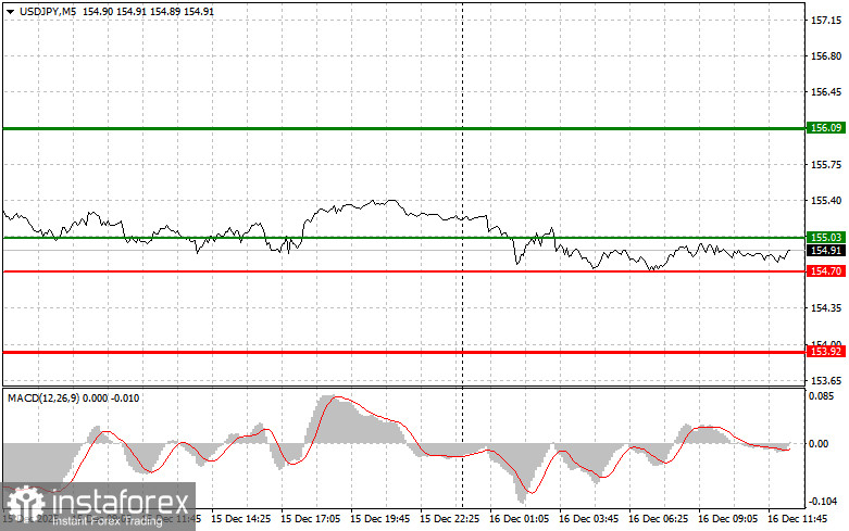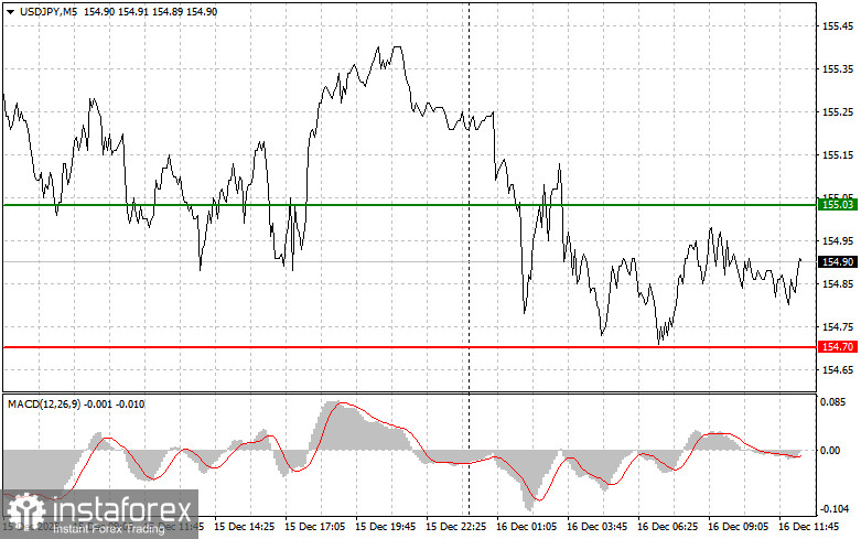 Сценарий №2: продавать USD/JPY сегодня также планирую в случае двух подряд тестов цены 155.03 в момент, когда индикатор MACD будет находиться в области перекупленности. Это ограничит восходящий потенциал пары и приведет к обратному развороту рынка вниз. Можно ожидать снижения к противоположному уровню 154.70 и 153.92.
