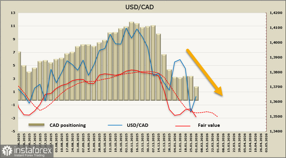 Чистая короткая позиция по CAD сократилась за отчетную неделю на 1.8 млрд, до -1.2 млрд, позиционирование близко к нейтральному. Расчетная цена уходит вниз от долгосрочной средней.