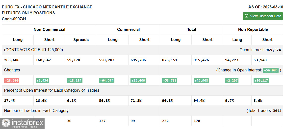 В COT-отчете (Commitment of Traders) за 10 марта наблюдалось сокращение длинных позиций и рост коротких. Учитывая продолжающуюся войну США и Израиля с Ираном, нет ничего удивительно, что в этом отчете вновь зафиксирован резкий рост коротких позиций по евро. Ситуация на Ближнем Востоке пока не приходит в норму, так что рассчитывать на кардинальные изменения в расстановке сил пока не приходится. В COT-отчете указано, что длинные некоммерческие позиции снизились на 28 900 до уровня 265 686, в то время как короткие некоммерческие позиции выросли на 2 454 до уровня 160 542. В результате спрэд между длинными и короткими позициями вырос на 18 114.