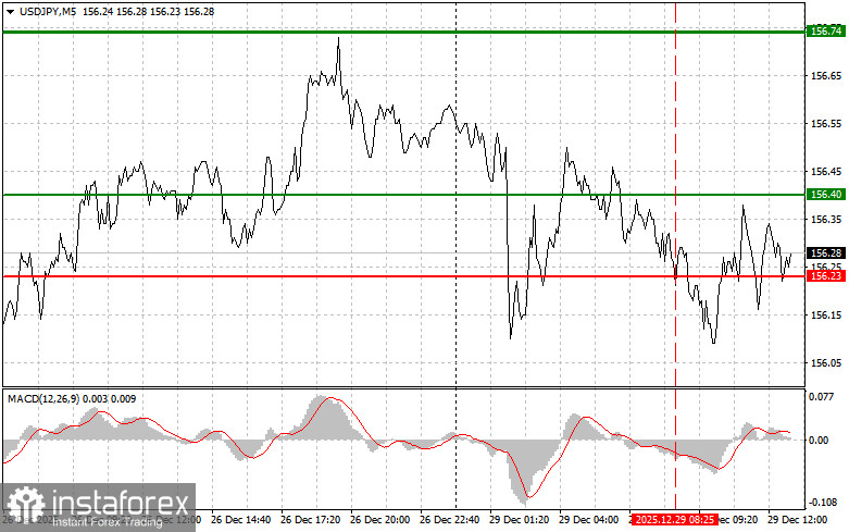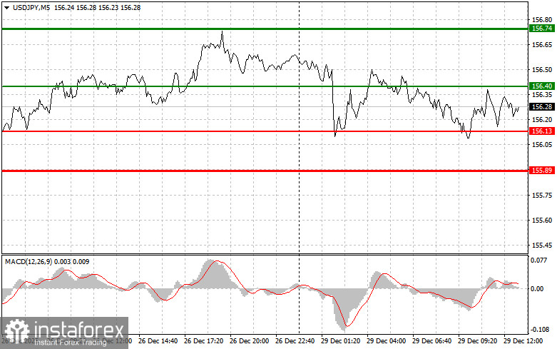 Сценарий №2: покупать USD/JPY сегодня также планирую в случае двух подряд тестов цены 156.13 в момент, когда индикатор MACD будет находиться в области перепроданности. Это ограничит нисходящий потенциал пары и приведет к обратному развороту рынка вверх. Можно ожидать рост к противоположным уровням 156.40 и 156.74.