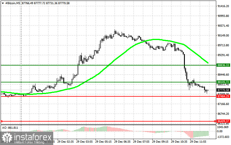 Сценарий №2: покупать биткоин можно от нижней границы $87 400 при отсутствии рыночной реакции на ее пробой в обратную сторону к уровням $88 100 и $88 800.