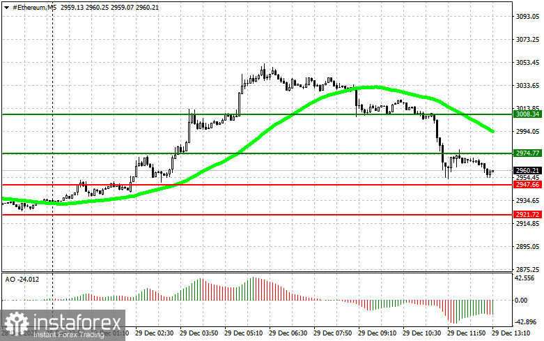 Сценарий №2: покупать эфир можно от нижней границы $2947 при отсутствии рыночной реакции на ее пробой в обратную сторону к уровням $2974 и $3008.