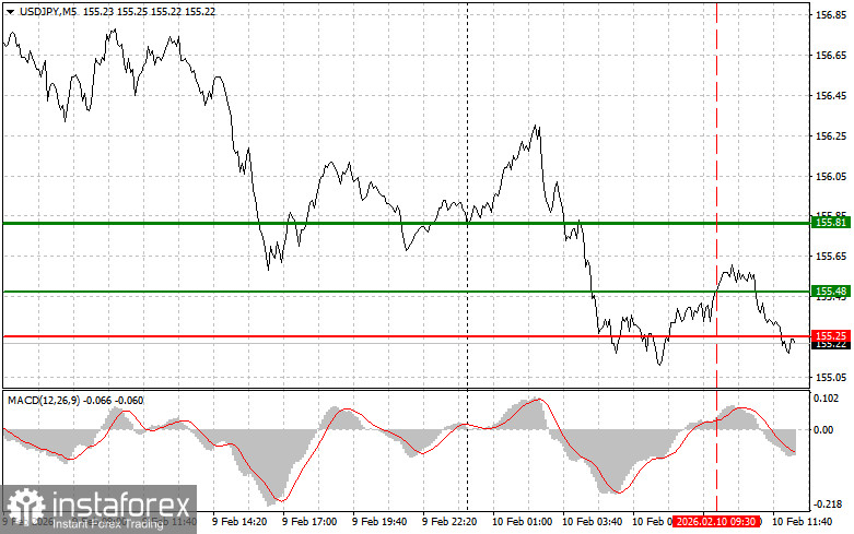 Сценарий №2: покупать USD/JPY сегодня также планирую в случае двух подряд тестов цены 155.11 в момент, когда индикатор MACD будет находиться в области перепроданности. Это ограничит нисходящий потенциал пары и приведет к обратному развороту рынка вверх. Можно ожидать рост к противоположным уровням 155.36 и 155.81.