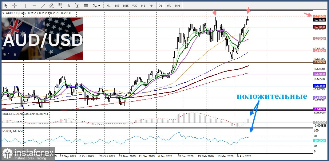 17.04.2026 09:30Пара AUD/USD уверенно удерживается вблизи мартовского максимума 0,7190, это говорит о завершении умеренной коррекции, наблюдающейся после достижения этого максимума с июня 2022 года. Спотовые цены находятся на пути к значительному недельному росту на фоне благоприятной экономической конъюнктуры.