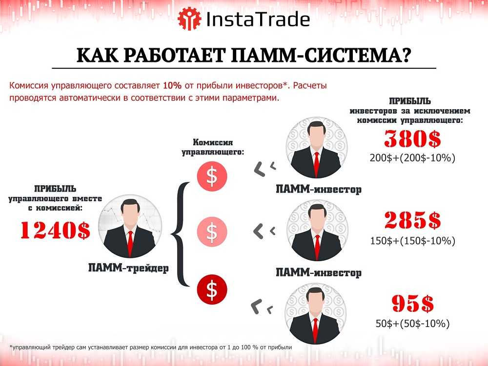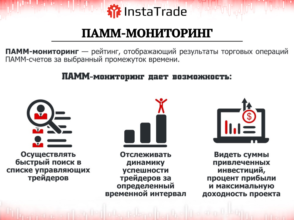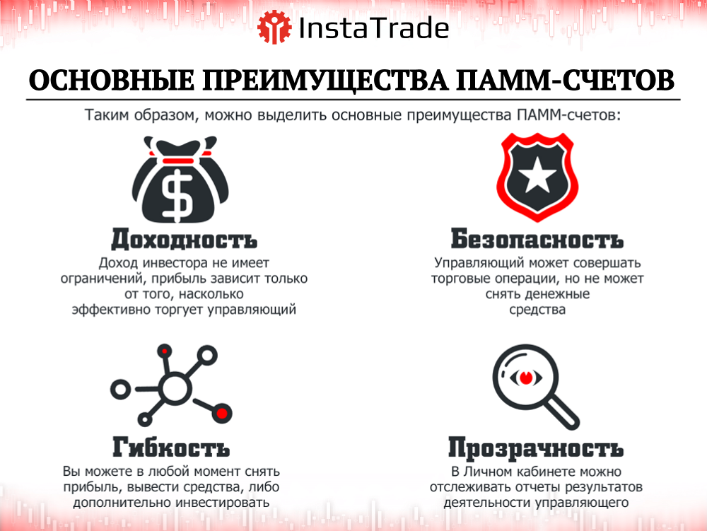 | 3 | После заполнения анкеты для ПАММ-системы в клиентском кабинете вы становитесь полноценным участником ПАММ-системы. В зависимости от того, какую роль в ПАММ-системе (Трейдер или Инвестор) вы выбрали для своего торгового счета, вы можете либо принимать инвестиции, либо инвестировать в других трейдеров, которые отображаются на главном сайте на странице мониторинга или в клиентском кабинете в разделе мониторинга ПАММ-Трейдеров. |