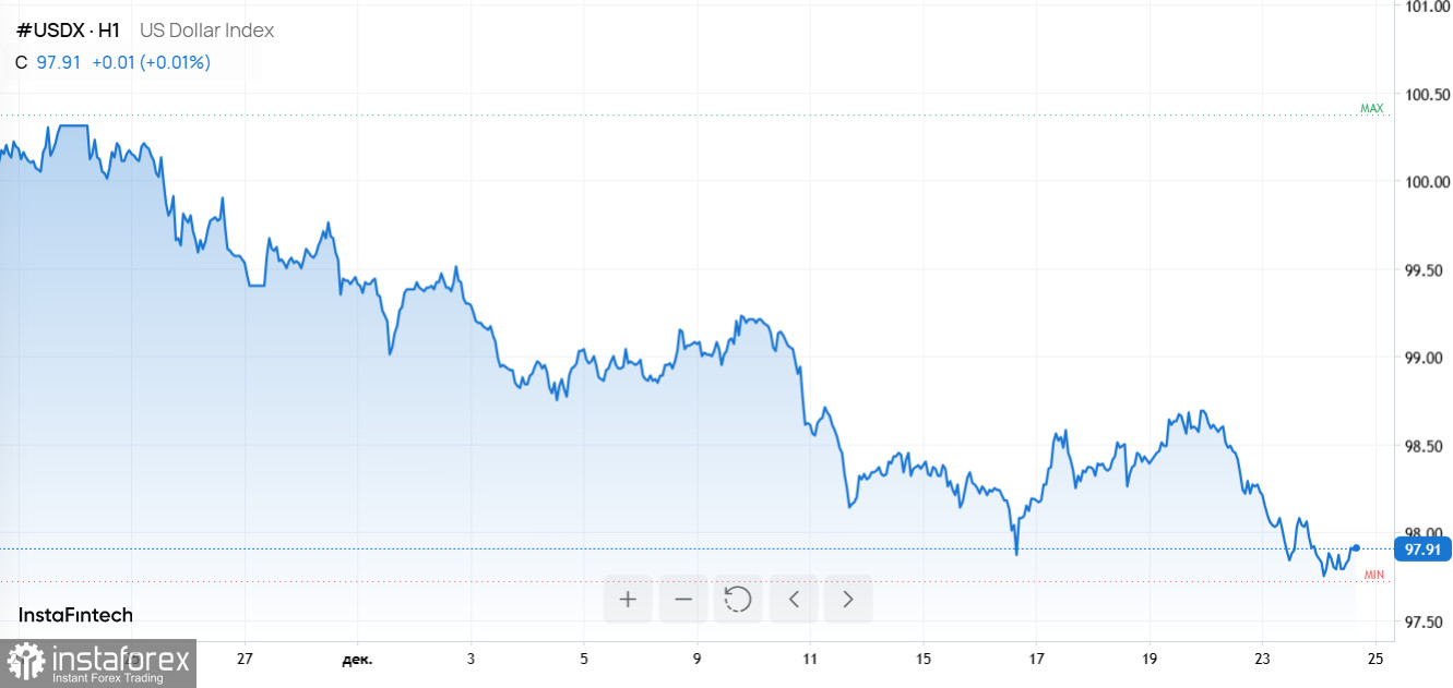 Индекс доллара опустился до 97,767, достигнув минимального уровня за последние 2,5 месяца. Этот обвал стал худшим со времен 2003 года, несмотря на сильные экономические показатели: ВВП США в третьем квартале вырос на впечатляющие 4,3%, превзойдя прогнозные 3,3%.
