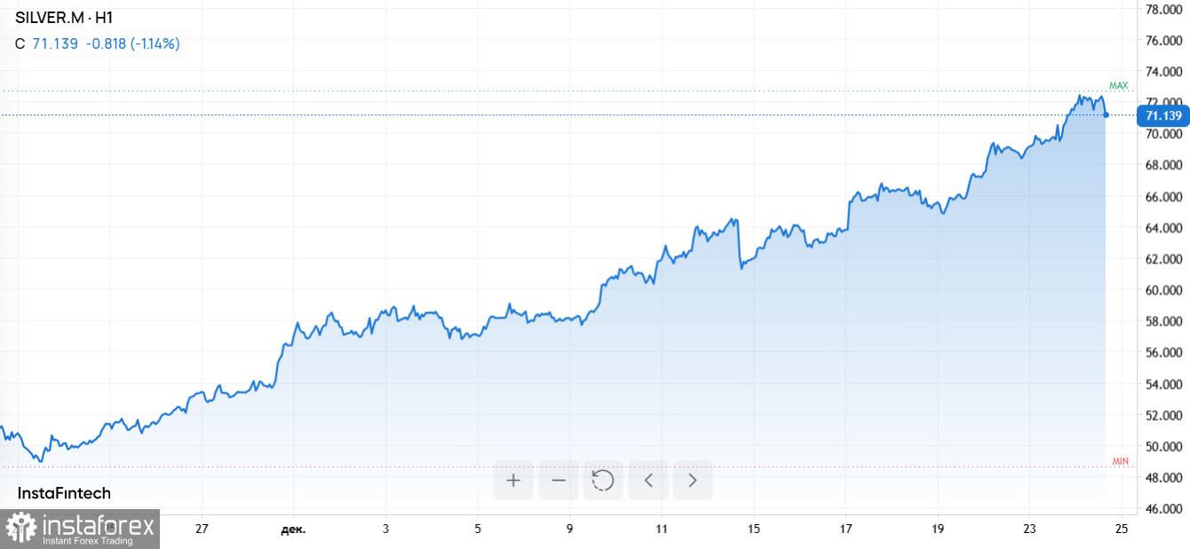 К 24 декабря цена серебра стабилизировалась на уровне $72,11 за унцию, хотя днем ранее впервые в истории преодолела психологическую отметку в $70. Рост белого металла отличается от других активов – он обусловлен серьезными структурными перекосами на рынке. По данным Института серебра, рынок уже пятый год подряд сталкивается с дефицитом предложения, и к 2025 году совокупный дефицит с 2021 года может достичь 800 миллионов унций – это практически равняется годовому объему добычи.