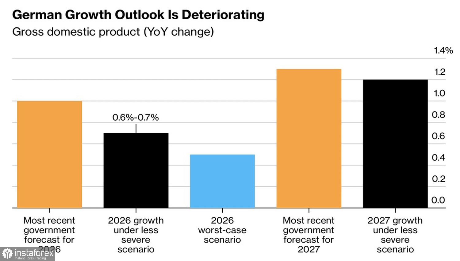 Чем дольше будет длиться конфликт на Ближнем Востоке, тем больше пострадает немецкая экономика. Правительство понизило прогноз роста ВВП с 1% до 0,5% в 2026, при условии что боевые действия будут продолжаться долго, а цены на нефть еще больше вырастут. Если Brent стабилизируется на текущих уровнях, валовой внутренний продукт расширится на 0,6-0,7%.